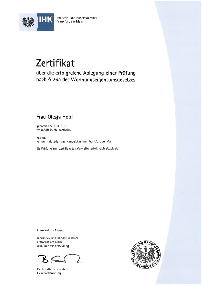Über die erfolgreiche Ablegung einer Prüfung nach § 26a des Wohnungseigentumsgesetzes.
